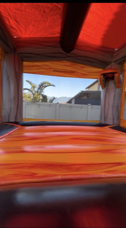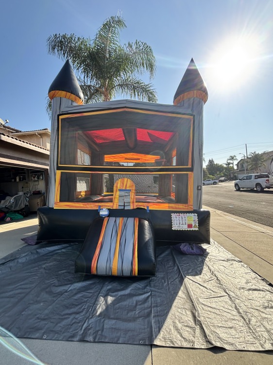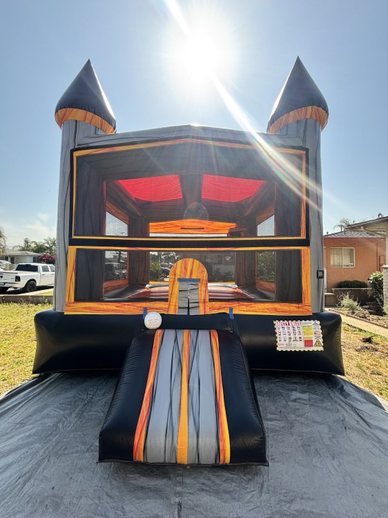 This 13x13 Black Silver castle needs an area of 16x19. It has a basketball hoop and comes with a ball.