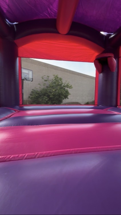 This 13x13 Hot Pink castle needs an area of 16x19. It has a basketball hoop and comes with a ball.